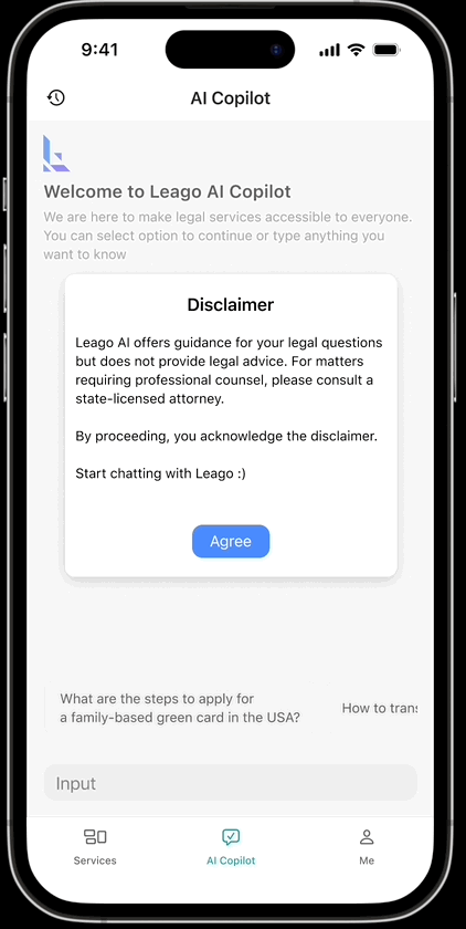 Leago AI, Inc. is an AI-powered legal assistance service. It helps immigration applicants quickly assess their eligibility, check priority dates, and prepare the necessary documents through an AI assistant. More application scenarios may be developed in the future. This reduces the costly expenses of hiring a law firm for users and increases efficiency.